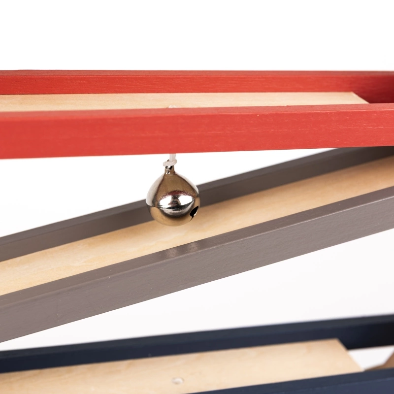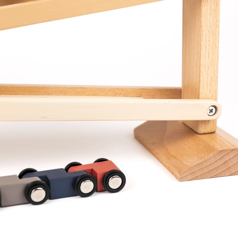 Gotowi? Start! Obserwuj, jak małe drewniane samochodziki zjeżdżają po kolorowych rampach, dzwoniąc radosnym dzwoneczkiem w połowie drogi. Gra stymuluje koordynację ręka-oko, śledzenie wzrokiem i rozumienie związku przyczynowo-skutkowego.