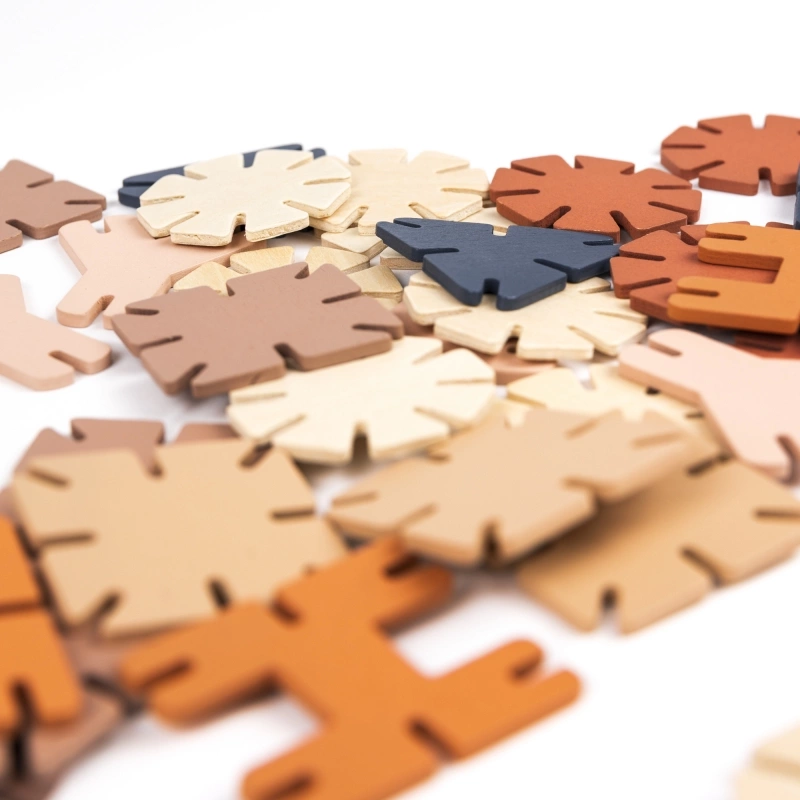 Drewniane klocki, w wielu stonowanych kolorach i kształtach pozwoli na stworzenie niesamowitych, przestrzennych konstrukcji 3D. Do wytworzenia jest wszystko, co tylko podpowie maluchowi wyobraźnia. Łączenie klocków odbywa się poprzez wsunięcie jednego w drugi.