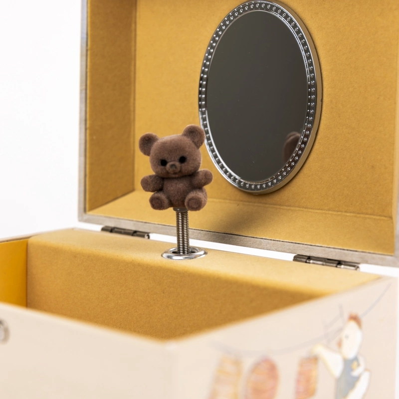 Kiedy wieczko jest zamknięte pozytywka nie wydaje dźwięków, po otwarciu i nakręceniu gra melodię a brązowy miś obraca się dookoła.